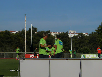 Em todo o caso, não deixou de ser um fim de tarde bem passado, pois sempre estavam lá o João Moutinho, o Varela, o Eduardo, o Carlos Martins - que anda claramente com ganas. Não me admirava nada se marcasse esta noite - o Rui Patrício, o Hugo Viana, entre outros. E também, Paulo Bento, Humberto Coelho e João Pinto. Aconteceu, aliás, uma coisa engraçada no início do treino. Estávamos nós a arranjar lugar nas bancadas quando reparámos no João Pinto, que olhava na nossa direção. Mais por graça do que por outro motivo qualquer, acenei-lhe.