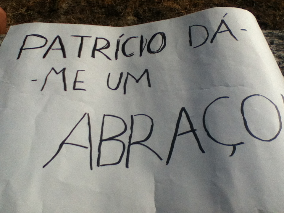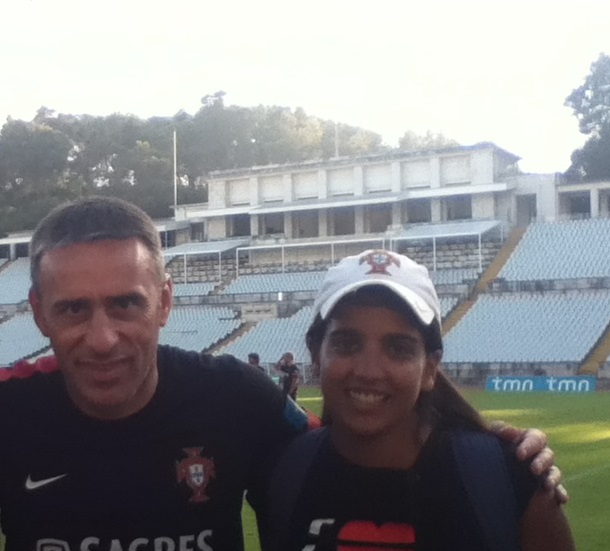 Não fomos as únicas, de resto. Ainda não estava ninguém à entrada do Estádio mas, mais acima, junto ao parque de estacionamento, já se haviam juntado umas boas trinta pessoas, à espera do autocarro da Seleção. Aqui, encontrámos a Bárbara, uma seguidora da minha irmã no Twitter, uma jovem sportinguista, tal como ela, que viera ao Jamor praticamente só para ver o Miguel Veloso, o seu herói. Trazia um cartaz verde fluorescente, pedindo uma camisola ao jogador do Kiev que já lhe tinha sido prometida quando ela fora ao jogo com a Rússia.