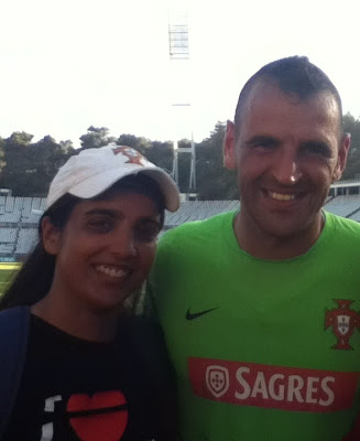 Entretanto, em resposta aos apelos dos outros adeptos, o Beto e o Eduardo vieram, também, ter connosco. Tal como mencionei acima, ia-me mantendo surpreendentemente calma - mas admito que, se lá estivesse o Cristiano Ronaldo, o Nani ou mesmo o Postiga, talvez caísse para o lado de sorriso no rosto, que os jogadores retribuíam quando nele reparavam. A minha irmã conseguiu uma fotografia com o Beto e, depois, veio comigo tirar uma foto com o Eduardo - ela pediu-me para a cortar das fotografias que publicasse aqui no blogue. Depois da foto e os agradecimentos, virei-me para o Eduardo e disse-lhe: