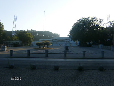 Por estes e por outros motivos - incluindo as peripécias na viagem de ida de há um ano - este nosso passeiozinho foi cuidadosamente planeado. Viemos equipadas com três garrafas de água fresca - porque o calor apertava - pacotinhos de bolachas para o caso de nos dar a fome, cartões carregados com dinheiro para os transportes, dinheiro extra para o caso de precisarmos de um táxi, o número de telefone da respetiva central, máquina fotográfica, cadernos e canetas para os autógrafos. Como agora vivemos em Lisboa, fomos de Metro até ao Cais do Sodré, onde apanhámos a Linha de Cascais. Apeámo-nos na minúscula e antiquada estação da Cruz Quebrada, atravessámos o pequeno bairro degradado e, debaixo do sol abrasador, subimos até ao Estádio, os holofotes entre as árvores servindo-nos de marco orientador. Receosa como estava dos atrasos dos comboios e de outros imprevistos, fiz questão de sairmos cedíssimo - como resultado, chegámos ao Jamor uma hora antes o início do treino.